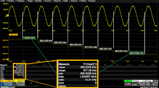 Figure 3 shows the track of a frequency measurement taken from another test, for purpose of illustration. Frequency decreases from ~1 MHz to ~956 kHz in eight steps corresponding to the cycles of the source waveform, which are clearly visible on the track.